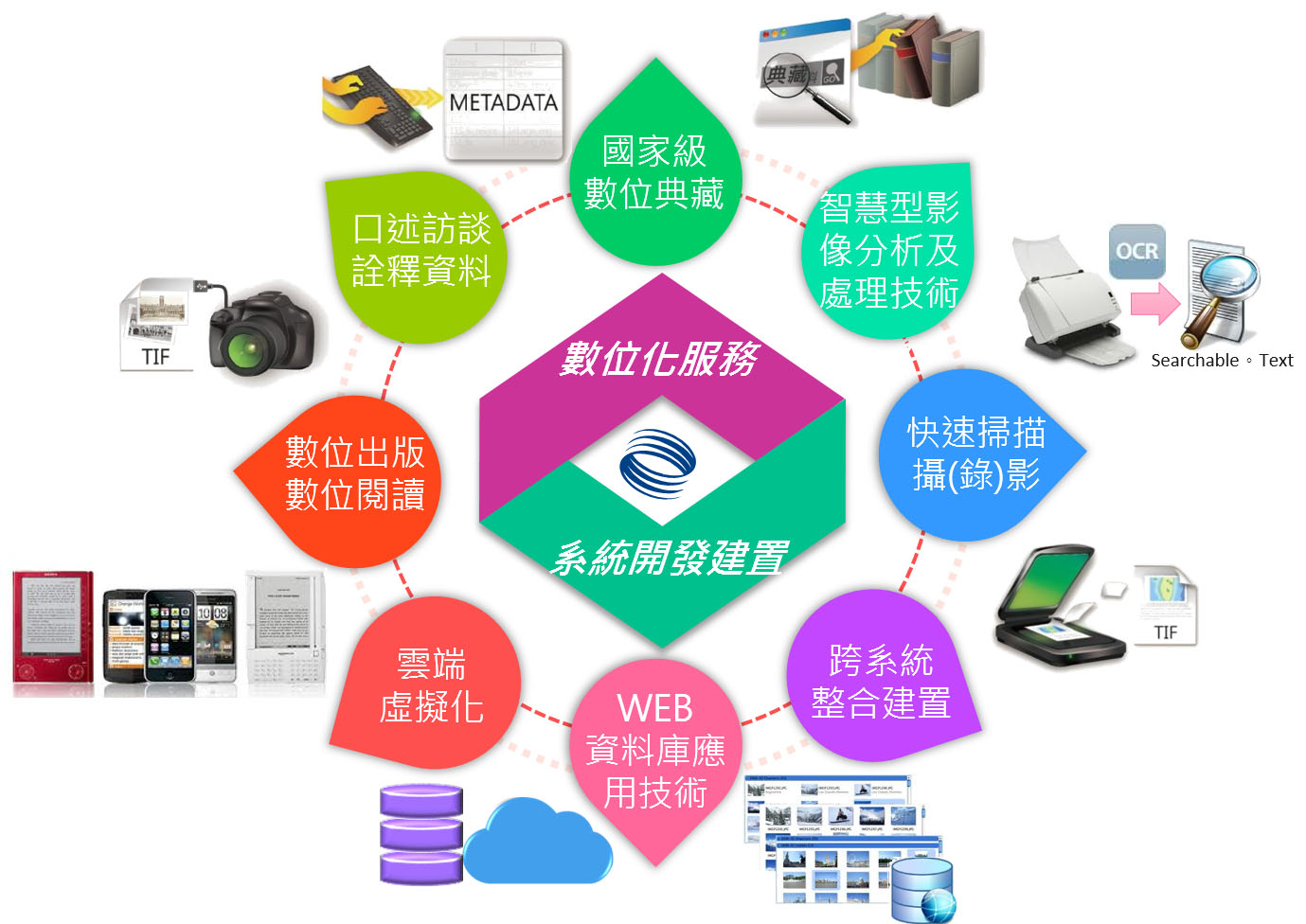 承接多年政府機關、財團法人及企業等專案,培養自我專業數化人力團隊,提借、整件、掃描、檢核、建檔、還卷等完整數化流程,因應數化類型引進各項設備,包含大圖掃描機、高速掃描器、平台掃描機、微縮影機等,並發展出系統整合,配合客戶數化內容建置影像調閱系統、影像辨識等技術。